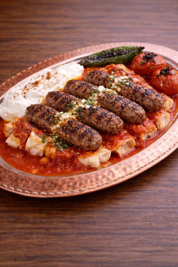 Yoğurt, pide, domates ve biber ile servis edilir.